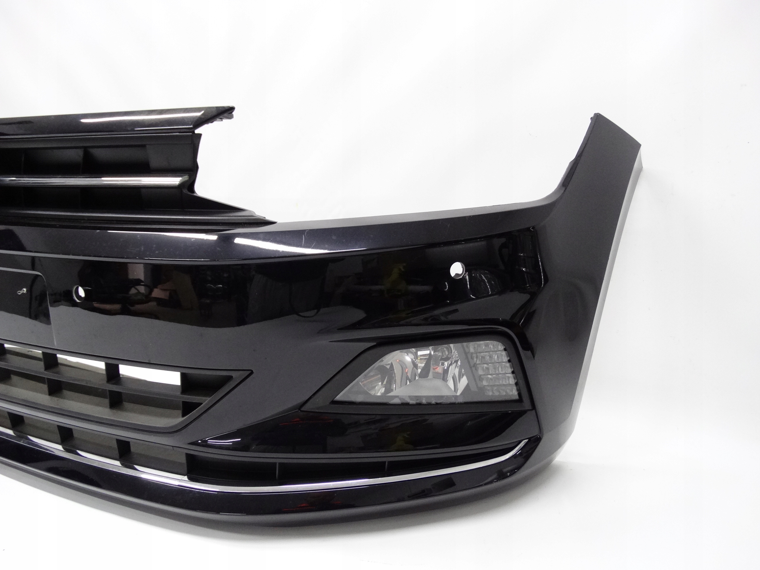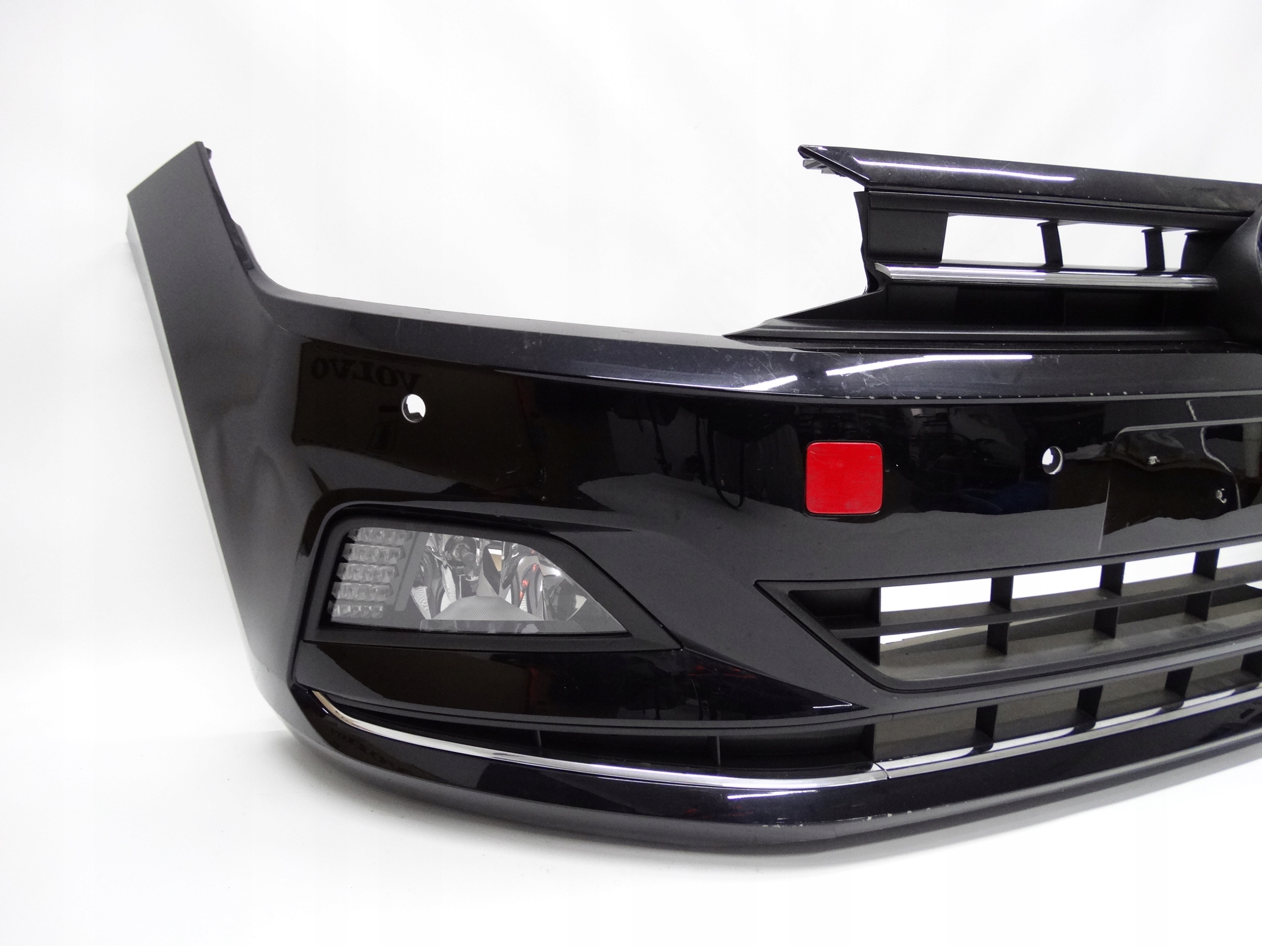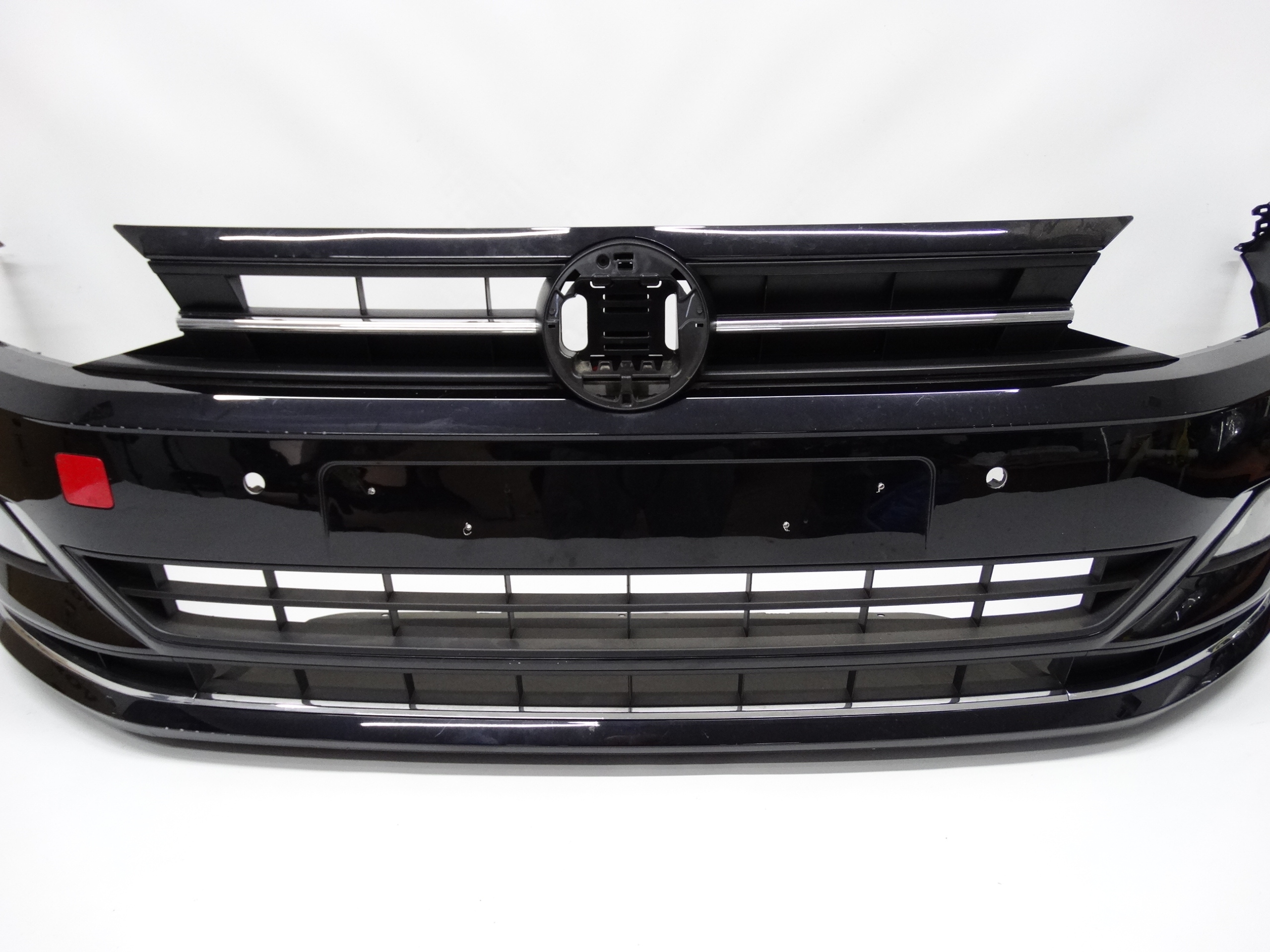 Oferujemy oryginalny przedni zderzak do VW Polo VI 2G 17-21 Highline. Zderzak niemal kompletny, z grillem, kratkami, ślizgami, halogenami i płytą. Grill, kratki, chromy i ślizgi całe, bez pęknięć i złamań. Skorupa w bardzo dobrym stanie, delikatnie uszkodzona – zdjęcie 8 i 9. Halogeny LED sprawne, świecące – uszkodzenia widoczne na zdjęciu nr 5, 6, 12, 13, 14 i 15.