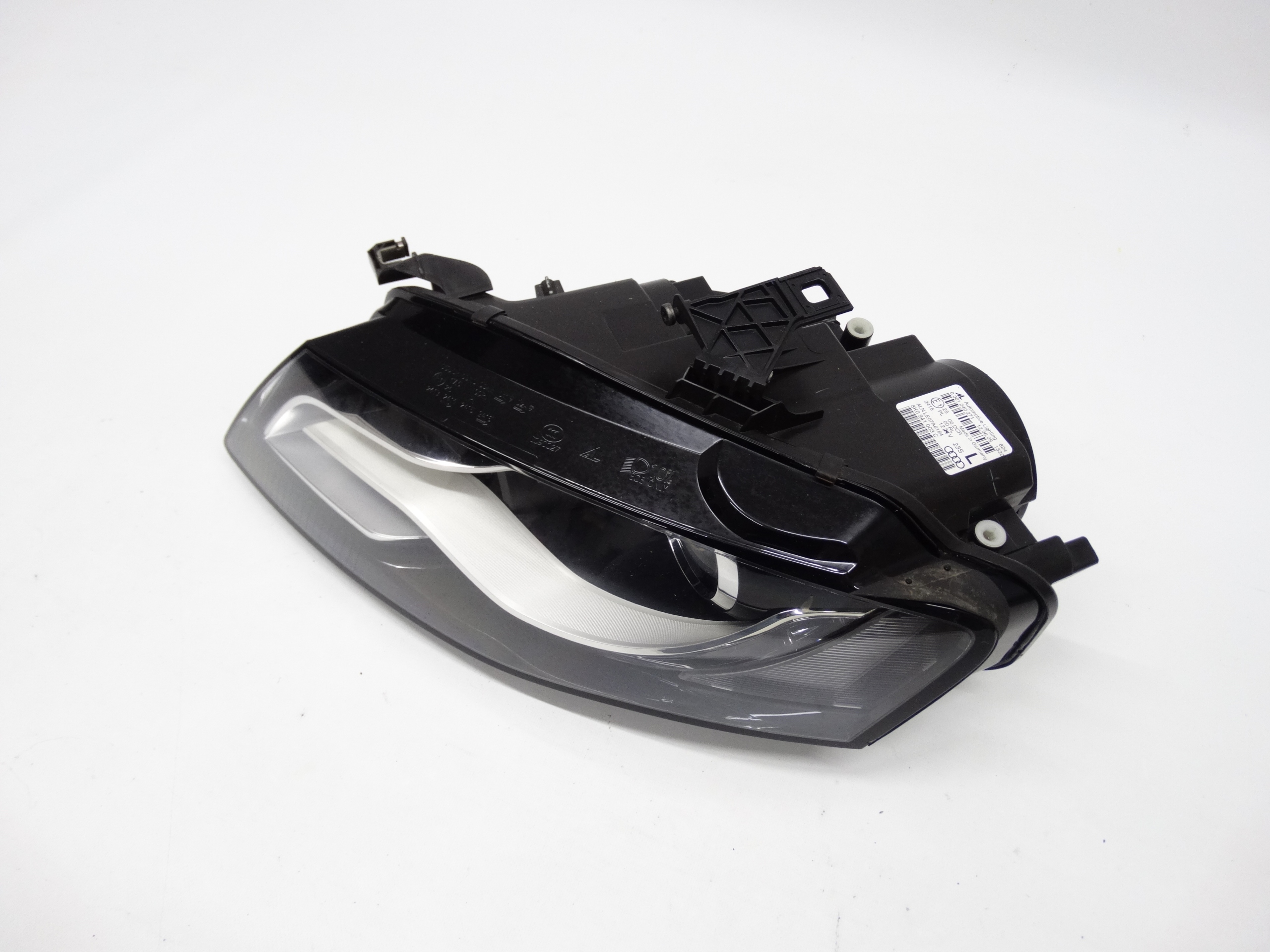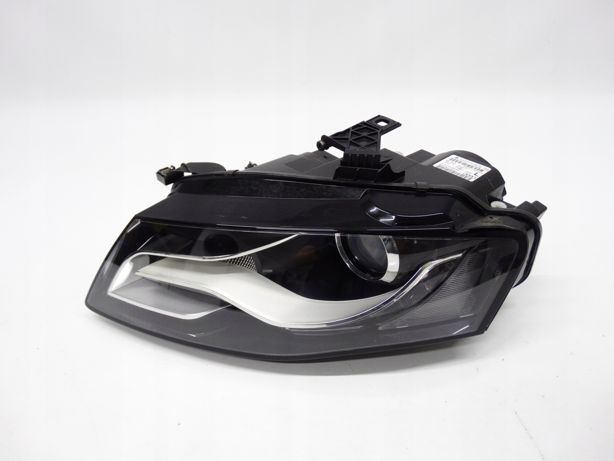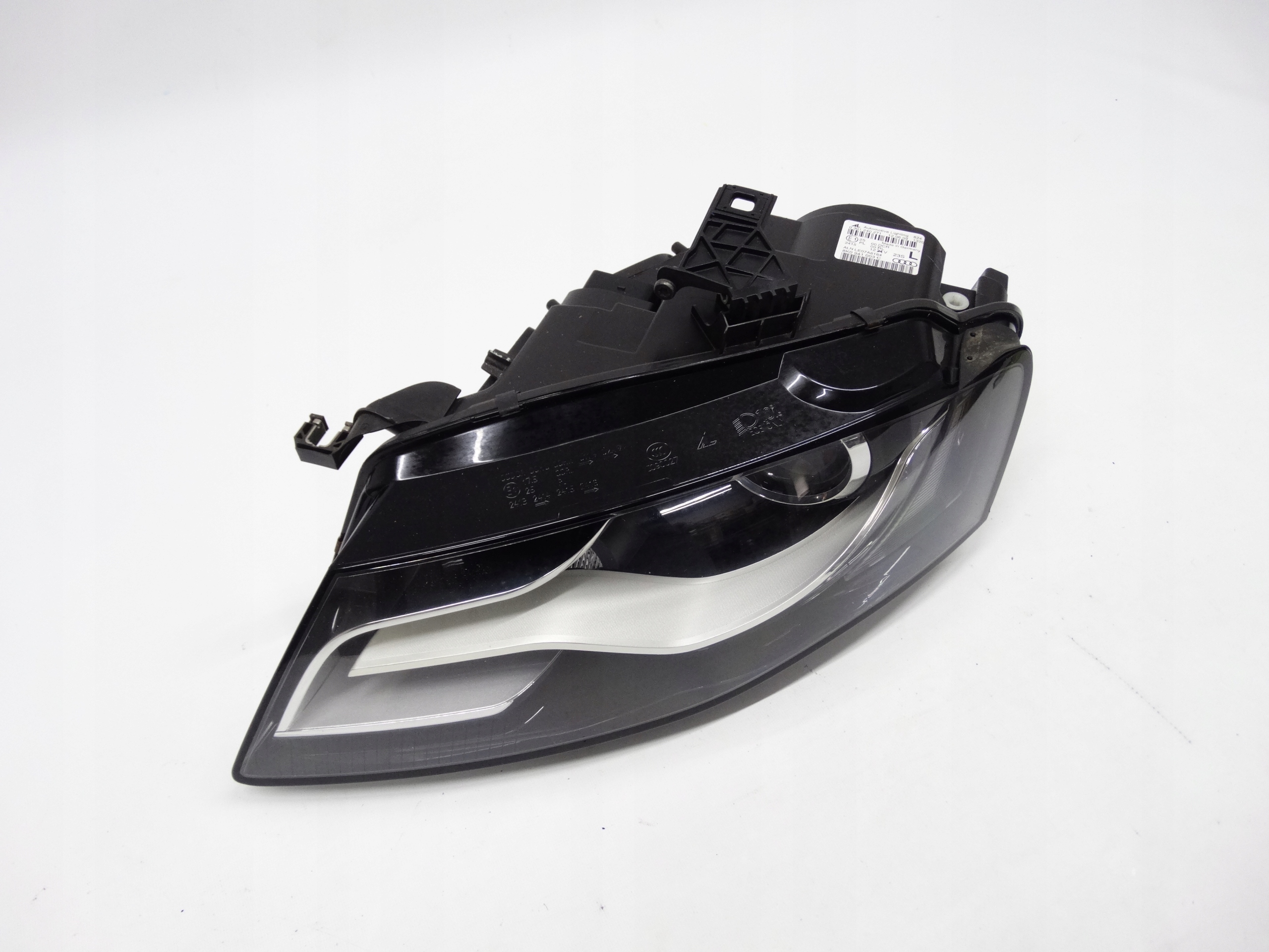 Oferujemy oryginalną przednią lewą lampę Bi-Xenon nieskrętny z LEDem do Audi A4 B8 07-11. Lampa w bardzo dobrym stanie, szkło całe, bez pęknięć i wyłamań, niepolerowane, posiada niewielkie otarcie na rancie – zdjęcia nr 6 i 7. Puszka cała, bez dziur, pęknięć i wyłamań, wszystkie uchwyty całe, oryginalne, nienaprawiane. Wersja europejska.